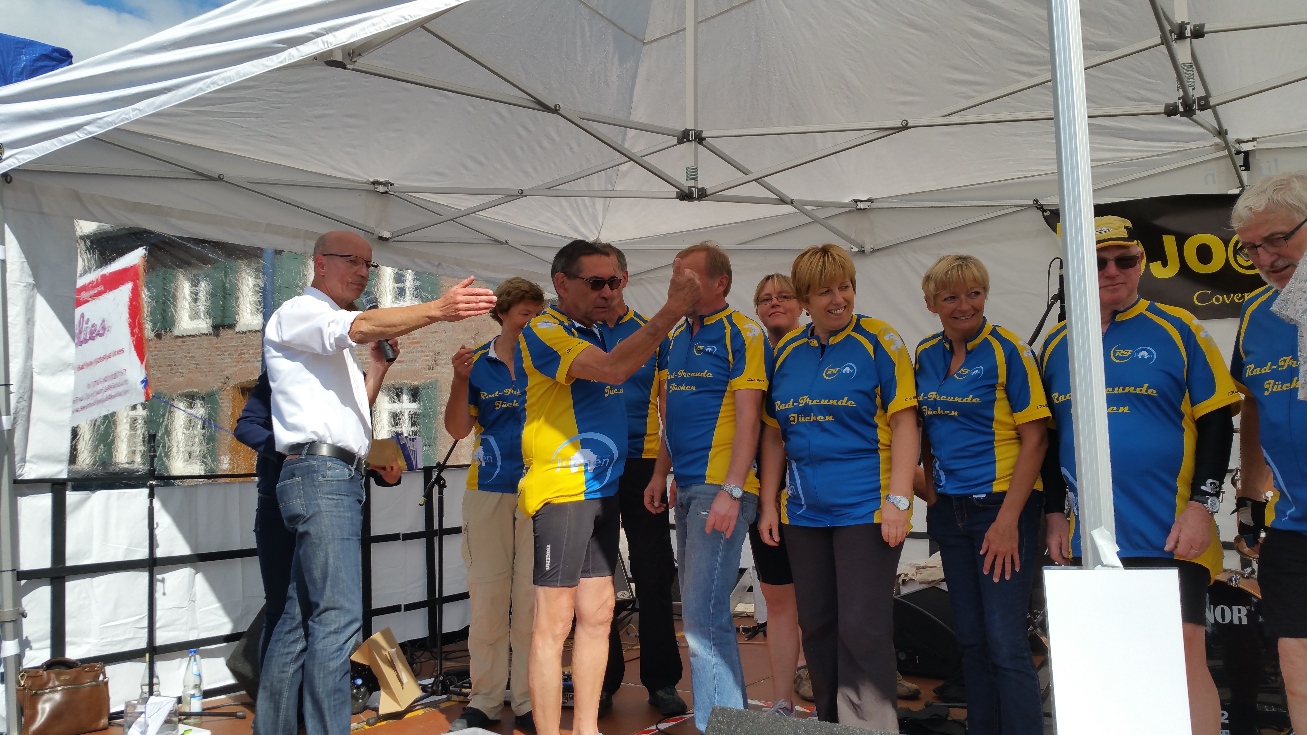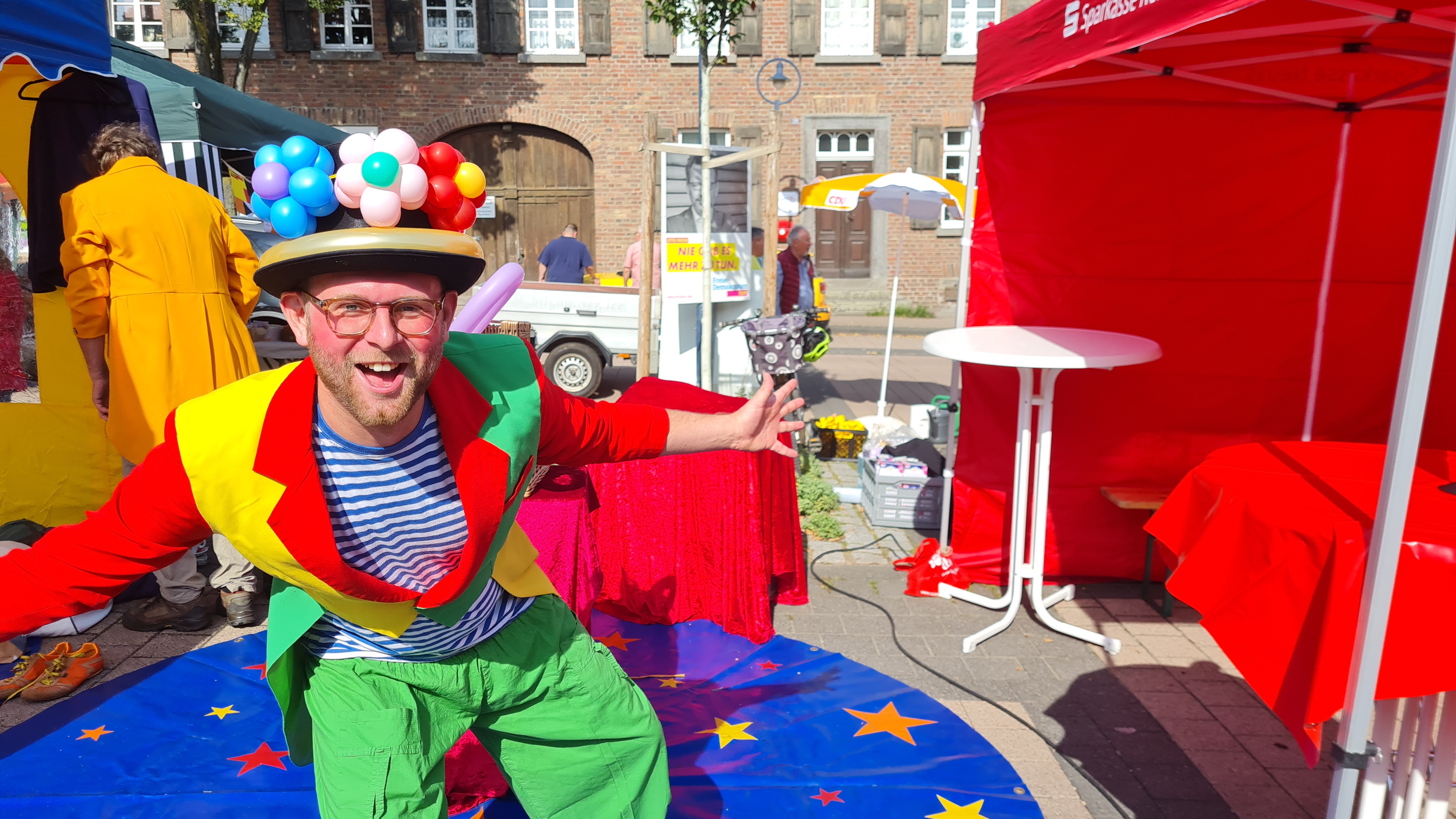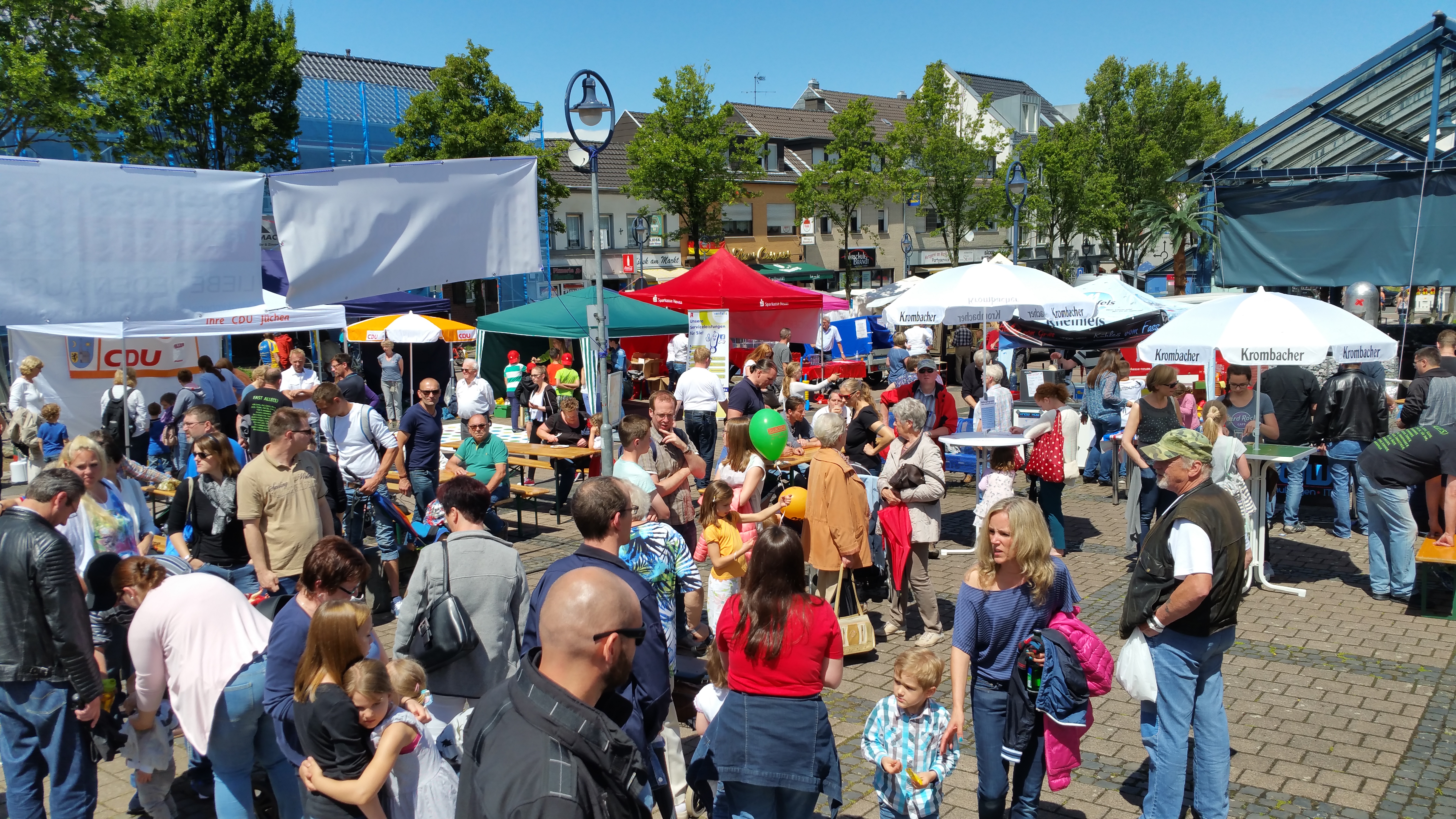 Viel Tam-Tam auf der Bühne – es wird gefeiert! Insbesondere Familien stehen im Blickpunkt des musikalischen und sportiven Bühnenprogramms. So führt Veranstalter Peter Sonnet von der Werbeagentur KNOW HOW durch den Tag und moderiert für das Publikum das bunt gemischte Programm. Auch hier wird Wert auf lokales Angebot gelegt. So war in den letzten Jahren z.B. der TV Jüchen mit Vorführungen aus den jeweiligen Sportabteilungen am Start. So z.B. das Fitnessgym CORE mit tollen Fitnesstanzdarbietungen und Kickboxbeiträgen. Musikalische Darbietungen wie die Big Band aus Jüchen, Zumba-Tanzgruppen, Jumping, das Saxophonquartett und das Jungendblasorchester der Jugendmusikschule, Gitarrenmusik von der Musikschule Pro Musica und oberregionale Künstler wie Mr T. mit Jazz-, Swing-, Soul-, Popmusicdarbietungen. Diverse Pop/Rockbands wie z.B. Moyo@work, Gentle Bandits, Nightwork, Five5be, etc. sind weitere Beispiele für die buntgemischte Tüte der Bühnenbeträge. Auch aktuelle Themen wie die Einweihung und Vorführung einer neuen Drehleiter der Feuerwehr durch den Bürgermeister oder die der Vorstellung dienenden Interviews mit neuem Unternehmer aus der Stadt vor einem breiten Publikum gehören mit zum Repertoire.